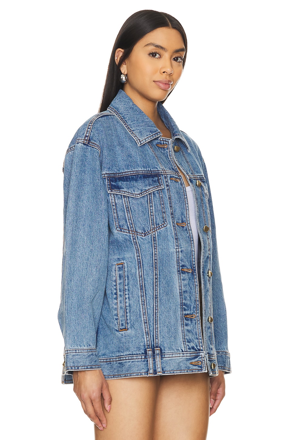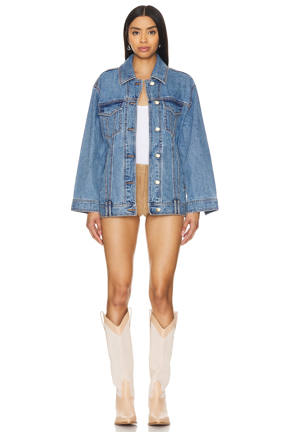 100% cotton Made in China Machine wash Front button closure Gold-toned hardware button accent Flap pockets at breast Side welt pockets Logo detail on back Revolve Style No. AJER-WO5 Manufacturer Style No. 24SU2003 |