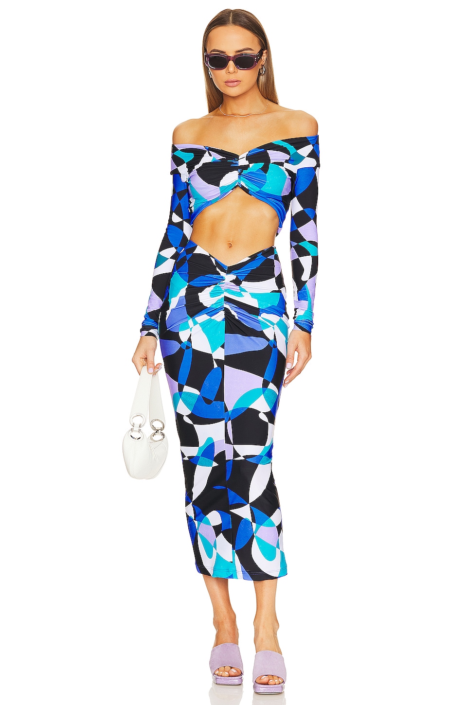 80% polyamide, 20% elastane Made in Turkey Dry clean only Unlined Hidden back zipper closure Front ruched seam Item not sold as set Skirt measure approx 94 cm in length Revolve Style No. NARR-WQ1 Manufacturer Style No. V SHAPE |