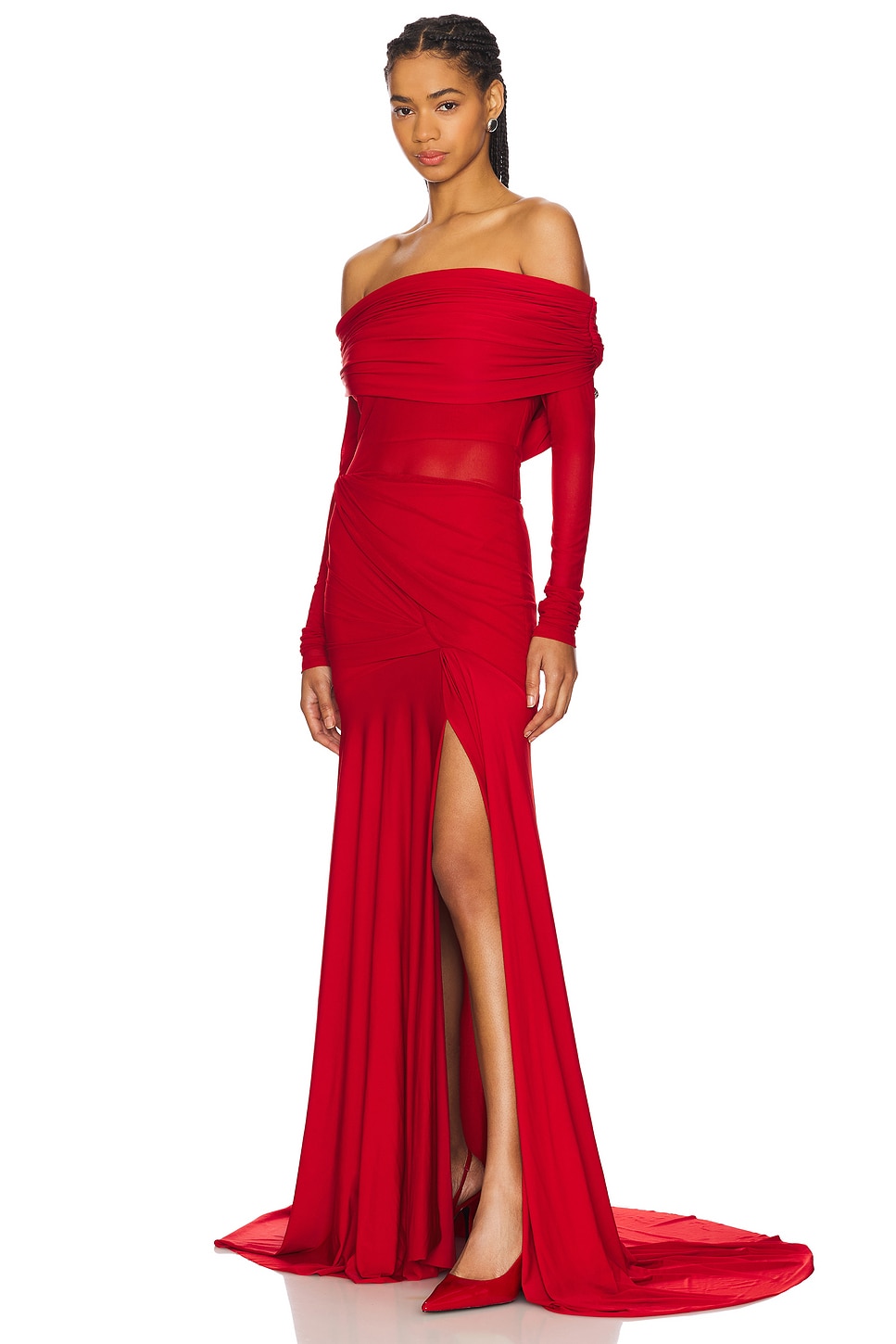 90% polyester, 10% spandex Made in India Dry clean only Unlined Pull-on styling with elastic neckline Foldover neckline Lightweight mesh bodice and stretch jersey fabric with side slit Neckline to shortest hem measures approx 76 cm and to longest hem approx 191 cm in length Revolve Style No. DEBY-WD15 Manufacturer Style No. DBG_SOL_020 |