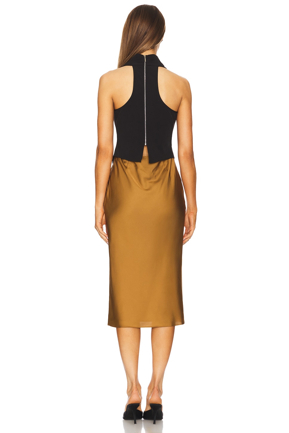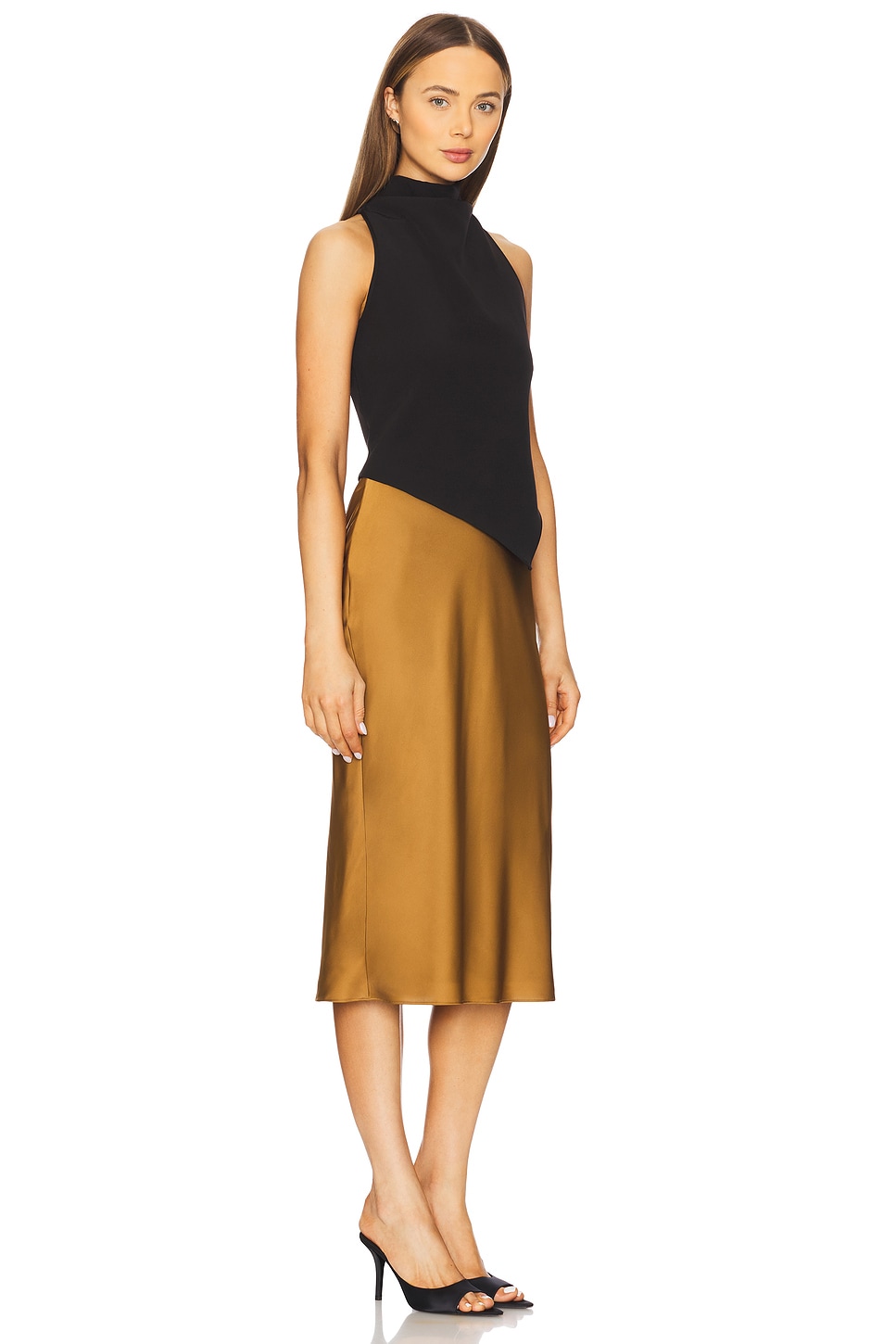 Self: 100% polyester Made in China Dry clean only Fully lined Hidden back zip closure Turtleneck styling Midweight crepe fabric with satin skirt Revolve Style No. ETOR-WD12 Manufacturer Style No. 70113077 |