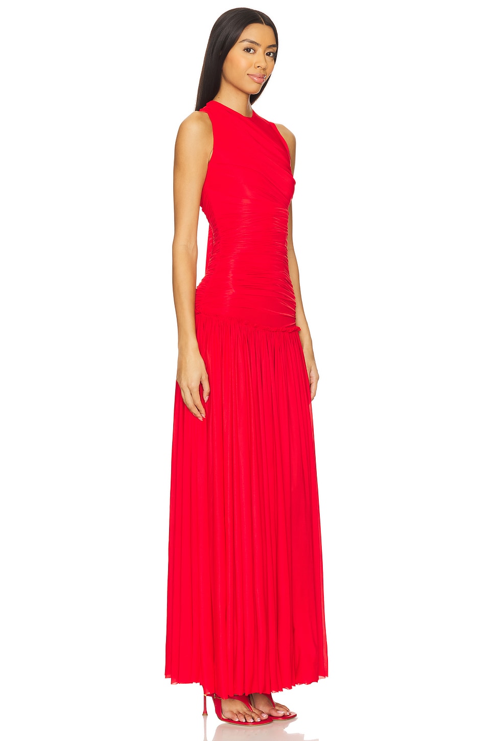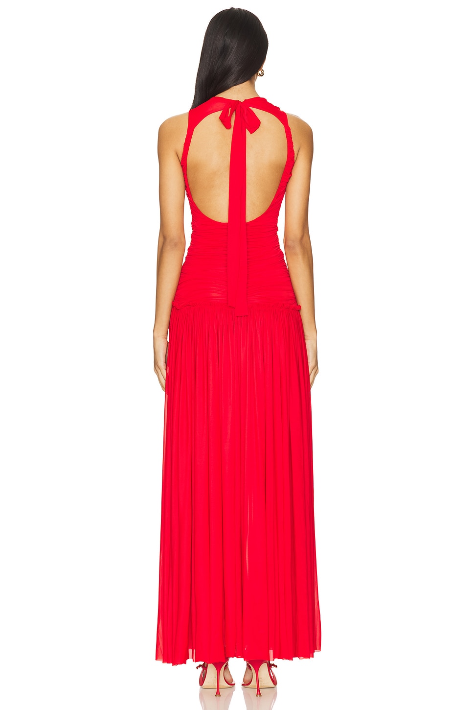 82% polyester, 18% elastane Made in Turkey Dry clean Unlined Open back with self-tie closure Ruched sides Lightweight jersey fabric Revolve Style No. SRER-WD30 Manufacturer Style No. WRS25DR01RD |