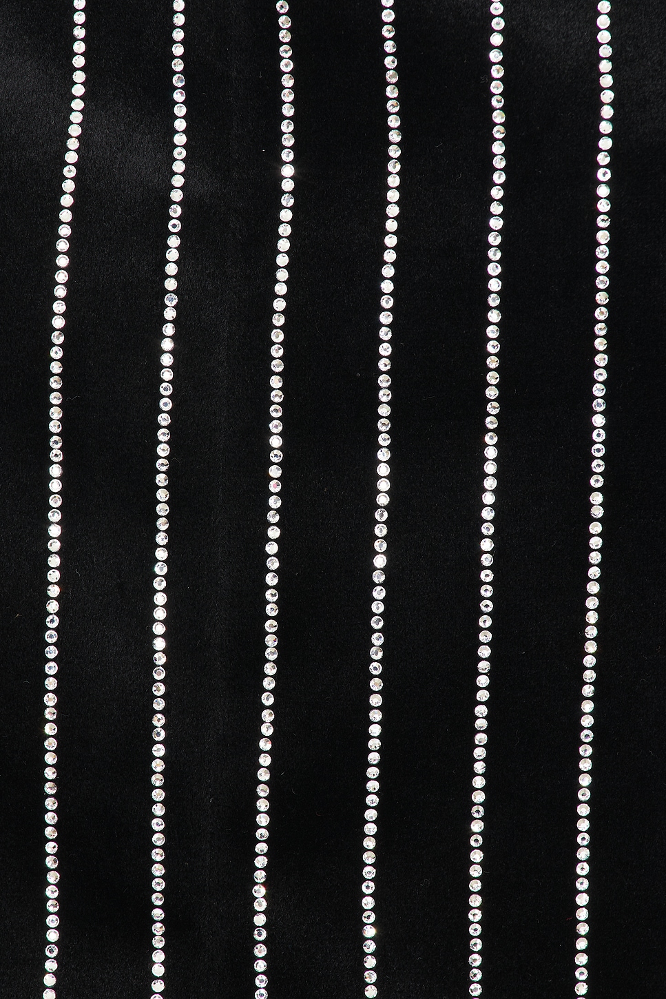 Velvet textile Imported Dry clean recommended Gusset snap button closure with thong back Hidden back zipper closure Shoulder padding Velvet fabric with heat-stamped crystal stripes Made in China Revolve Style No. APEF-WS84 Manufacturer Style No. BY038FW24 |