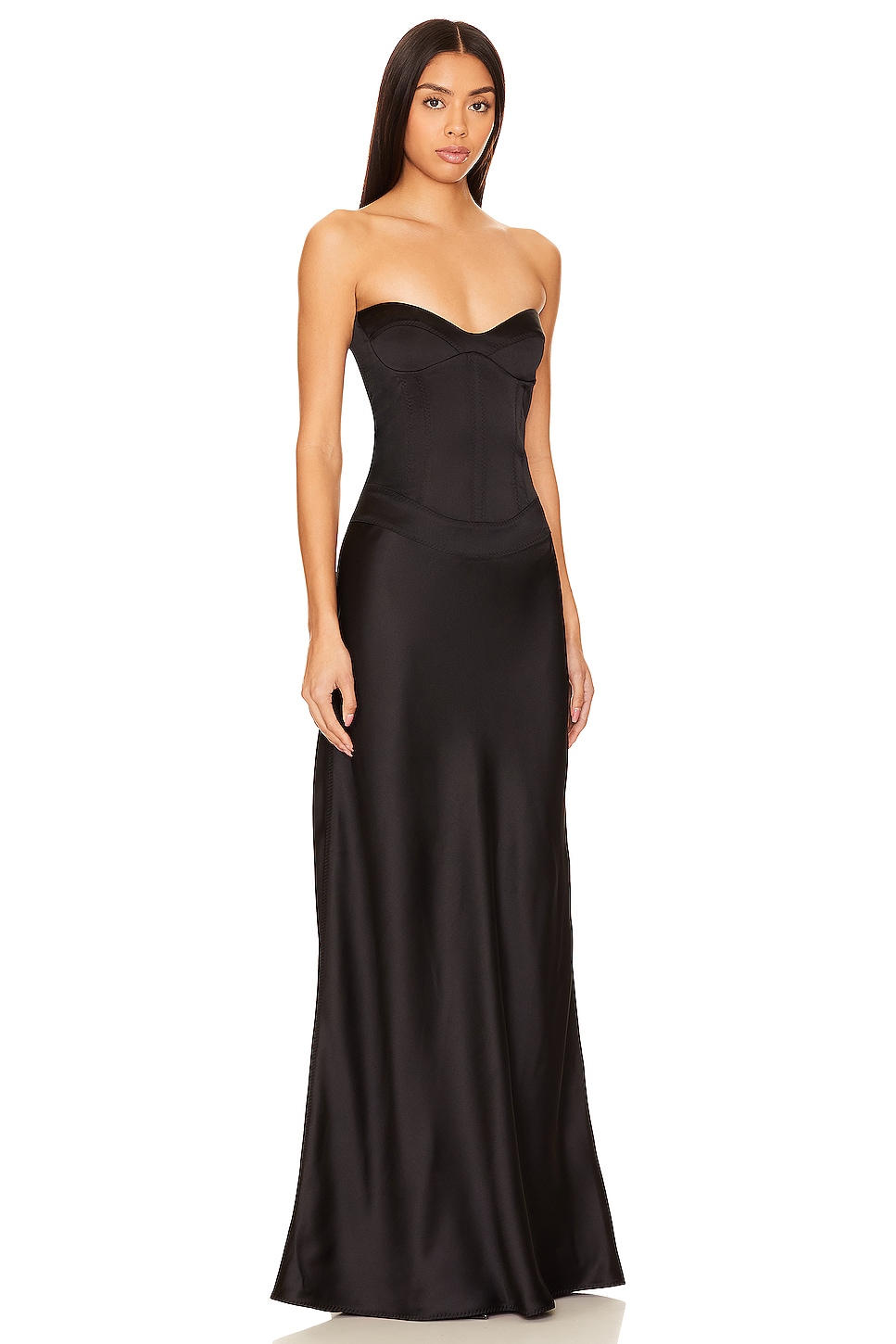 98% polyester, 4% elastane Made in Ukraine Dry clean only Unlined Hidden back zipper closure Boned bodice Midweight satin fabric Neckline to hem measures approx 142 cm in length Revolve Style No. ABER-WD44 Manufacturer Style No. SS2451 |