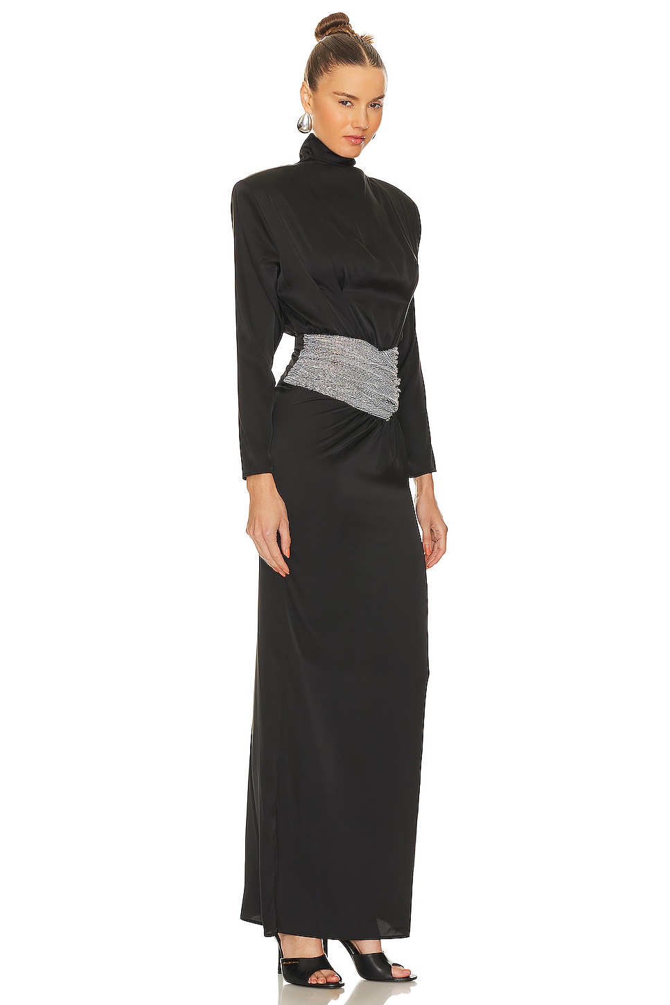 100% polyester Made in Turkey Dry clean only Unlined Hidden back zipper closure with zipper cuffs Satin fabric with embellished waist Revolve Style No. NARR-WD46 Manufacturer Style No. NA01FW0274B |