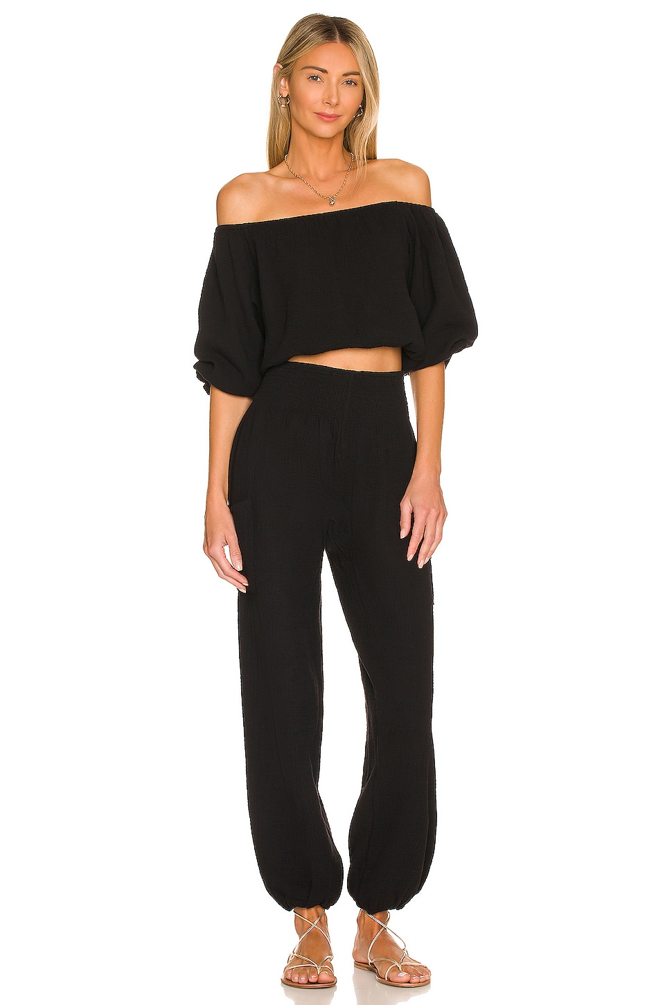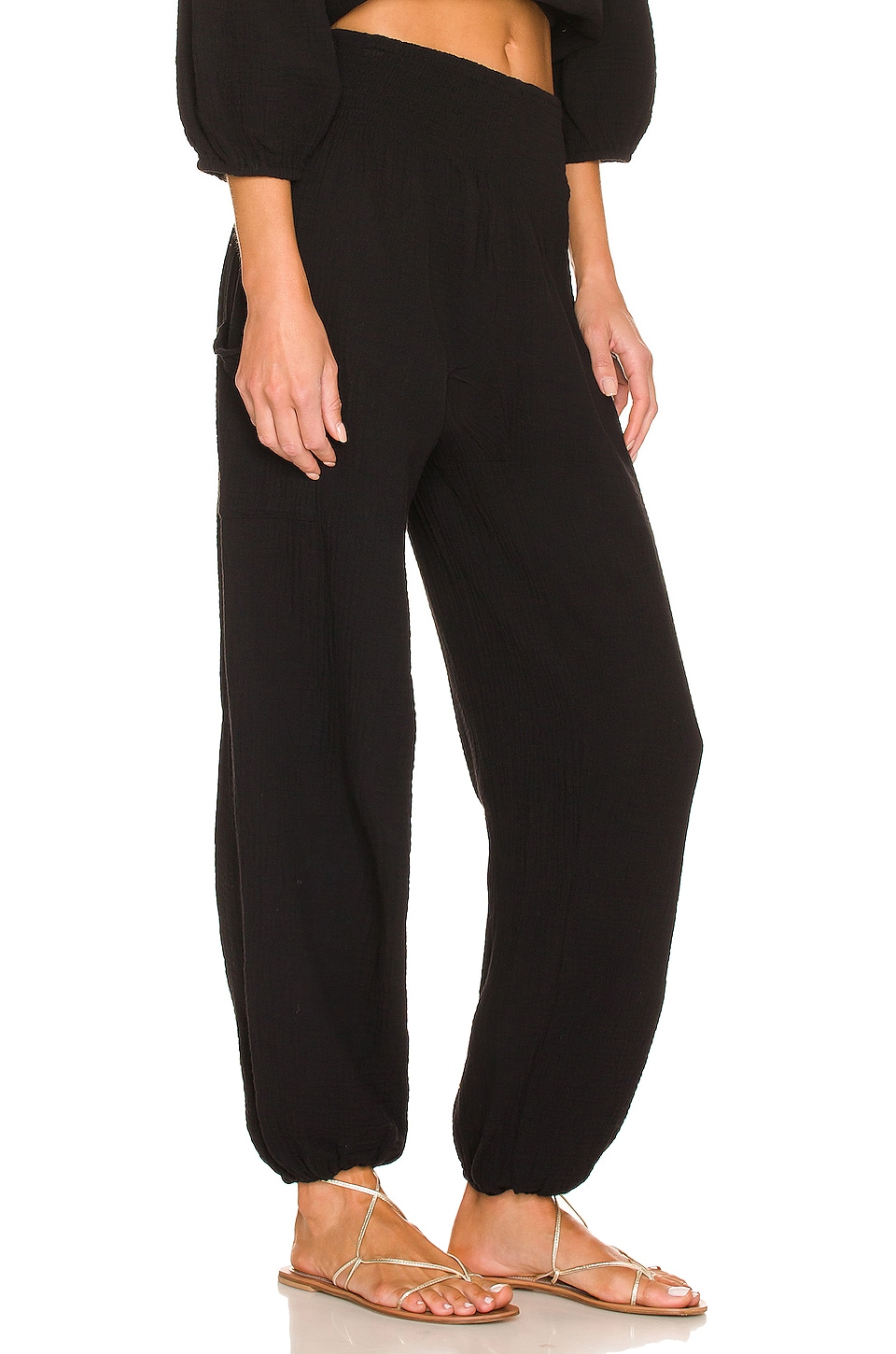 100% cotton gauze Made in China Machine wash Pull-on styling Smocked elastic waist band Side seam pockets Tapered smocked hem cuff 48 cm at the knee narrows to 25 cm at the leg opening Revolve Style No. BOBI-WP228 Manufacturer Style No. 51C-72217 Bobi is an LA-based line of dresses and tees made from some of the highest quality jersey at an affordable price. |
