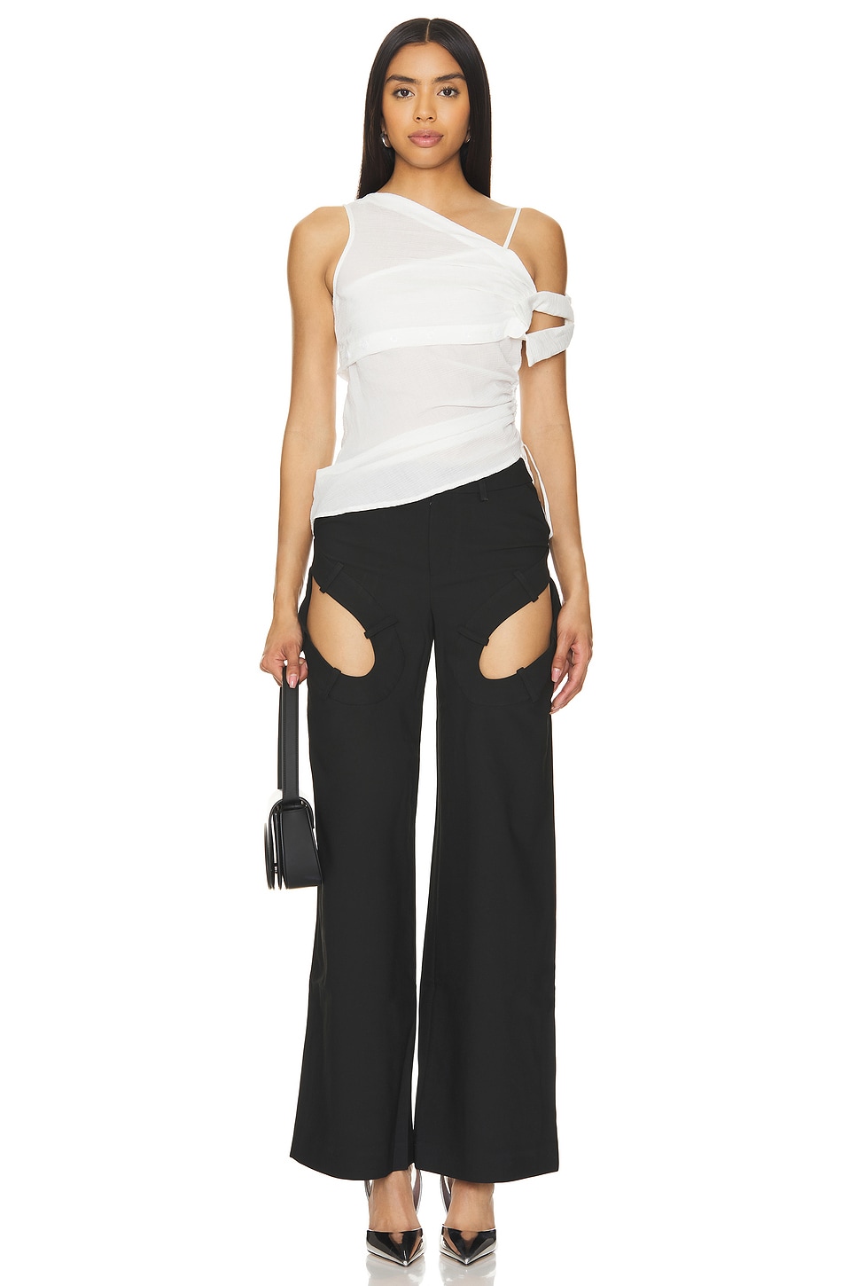 77% polyester, 16% rayon, 7% spandex Made in China Machine wash Front zipper with button closure 56 cm at the knee widens to 61 cm at the leg opening Revolve Style No. MRKN-WJ2 Manufacturer Style No. MN24SS07121 |