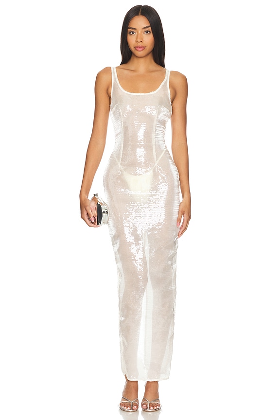 100% polyester Made in London Hand wash Unlined Hidden back zipper closure Sequin embellished organza fabric with back vent Revolve Style No. MCRE-WD34 Manufacturer Style No. KAIA |