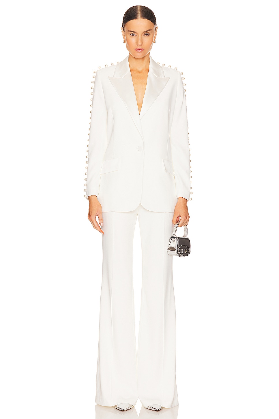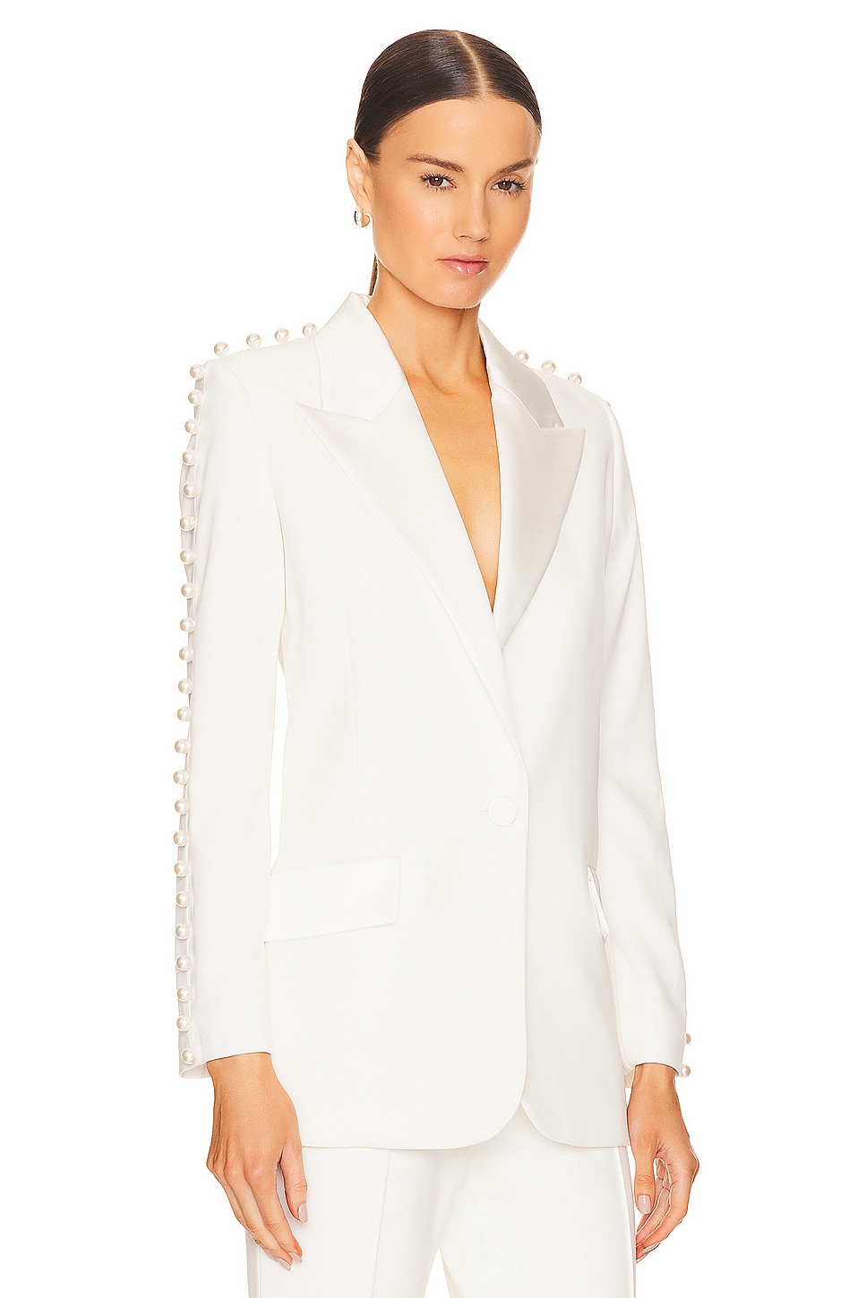 Self: 92% polyester, 7% elastane Made in China Hand wash Front button closure Side flap pockets Crepe fabric with pearl trim Item not sold as set Revolve Style No. NADR-WO1 Manufacturer Style No. NM156 |