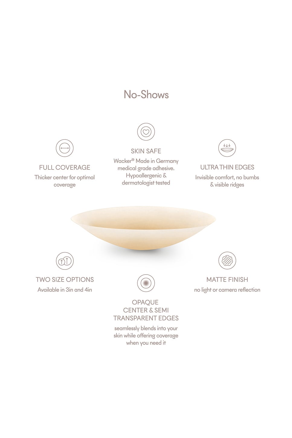 Braless with confidence. Introducing NOOD's newest reusable round adhesive nipple covers made from NOOD's signature Skin Safe Wacker German Medical Grade Adhesive matte silicone for invisible coverage and all day comfort. Made in China In No. 5 - soft tan 100% silicone with medical grade adhesive Sweat proof and waterproof Reusable 50-100x with proper care Includes 2 covers, each 3 inches in diameter Revolve Style No. NOOD-WI12 Manufacturer Style No. 3RNOSH5 One size fits most |