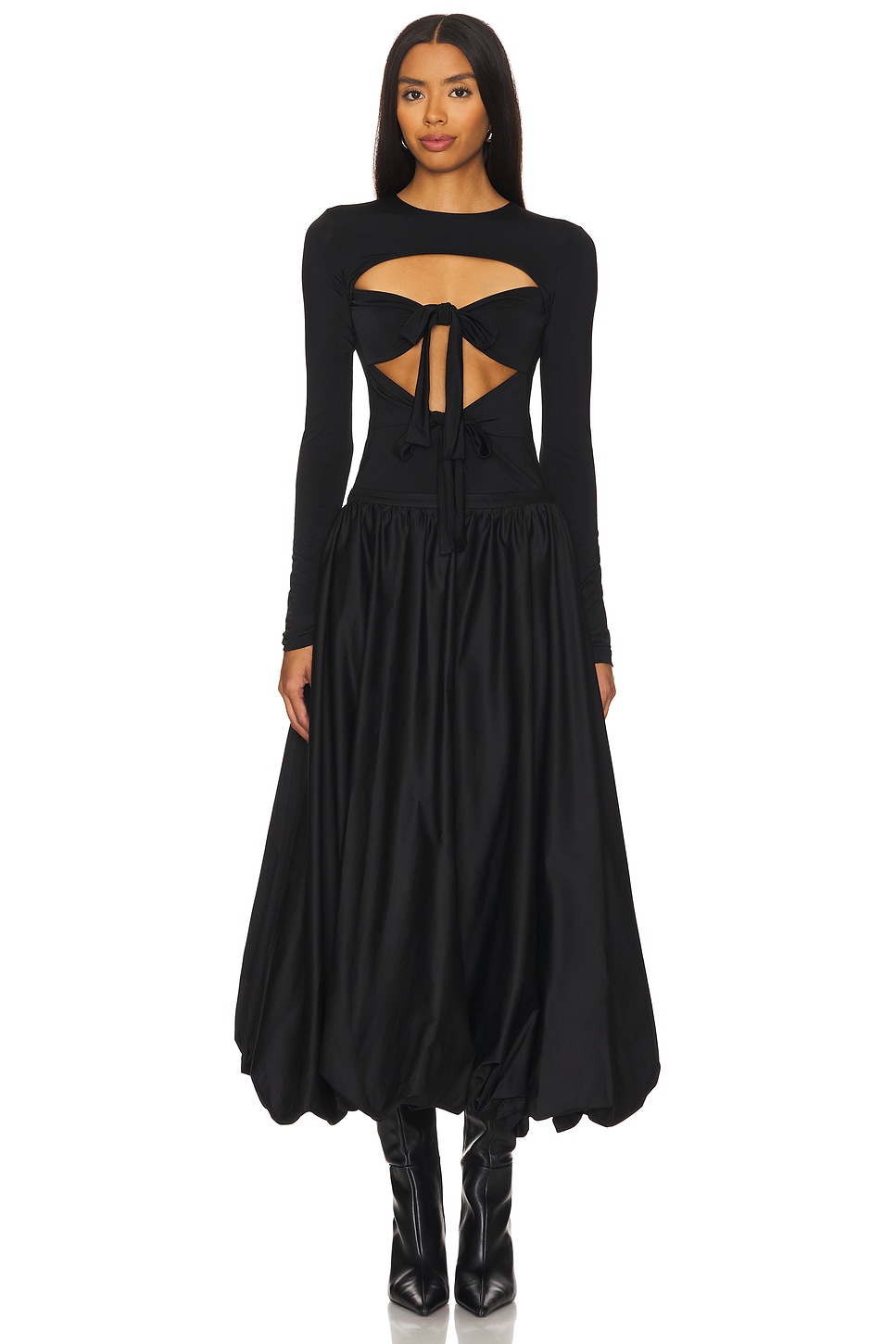 95% polyester, 5% elastane Made in Turkey Machine wash Pull-on styling Back keyhole with button closure Cut-out design with self-tie bralette Lightweight jersey fabric Revolve Style No. SRER-WS26 Manufacturer Style No. WFW24TP10BK |