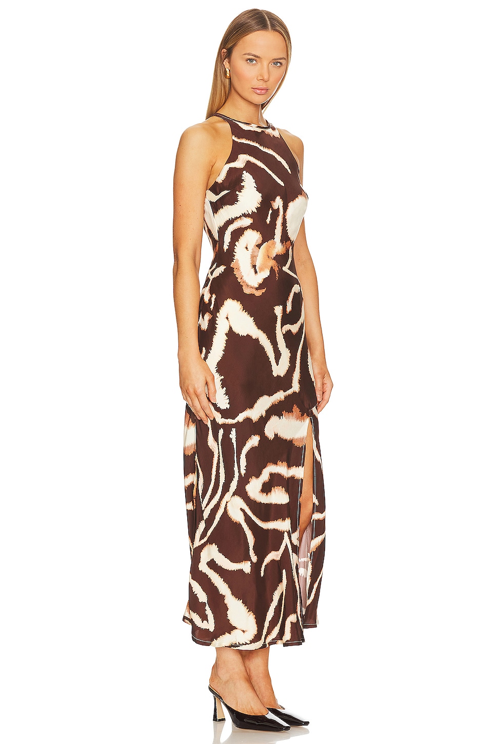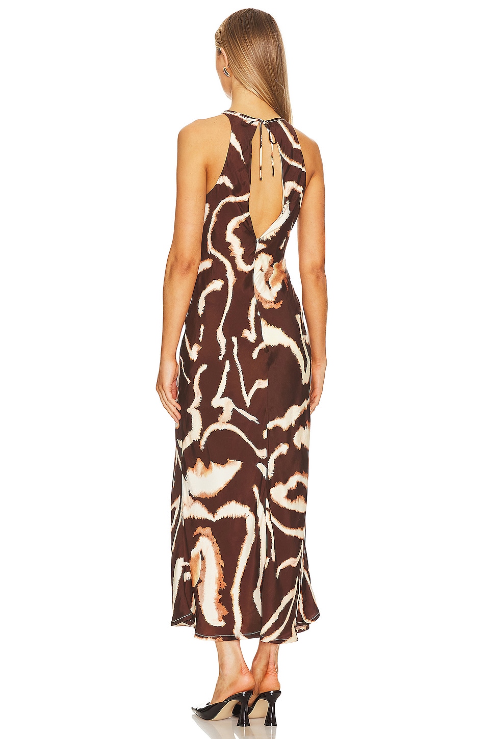 Self 1: 60% cupro, 40% rayon Made in China Hand wash Unlined Hidden back zipper closure Back keyhole with tie closure at neckline Sateen fabric with side seam slit Revolve Style No. SOVR-WD34 Manufacturer Style No. SVS123059 |